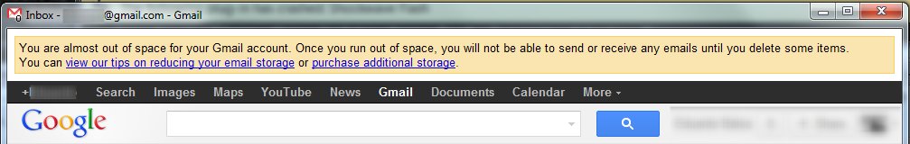 “You are almost out of space for your Gmail account. Once you run out of space, you will not be able to send or receive any emails until you delete some items.